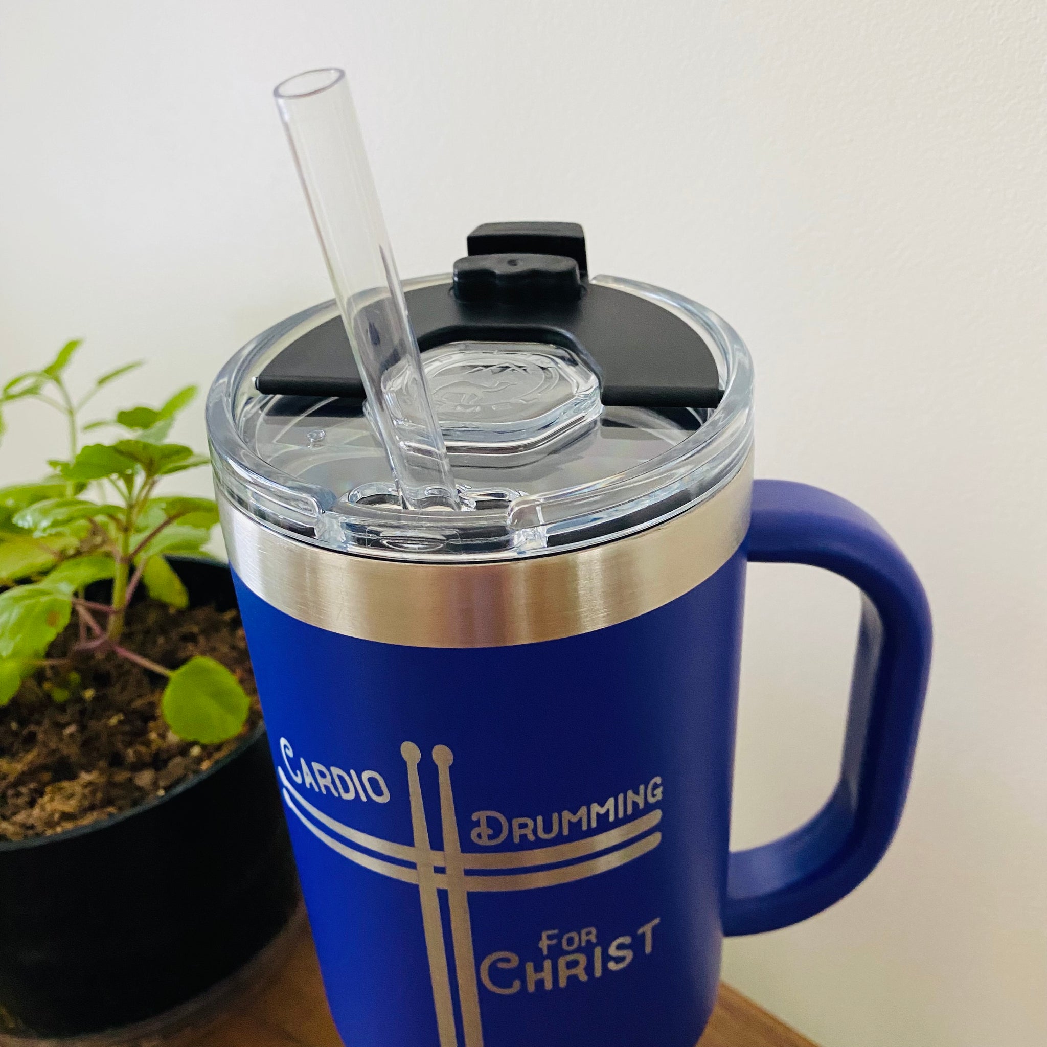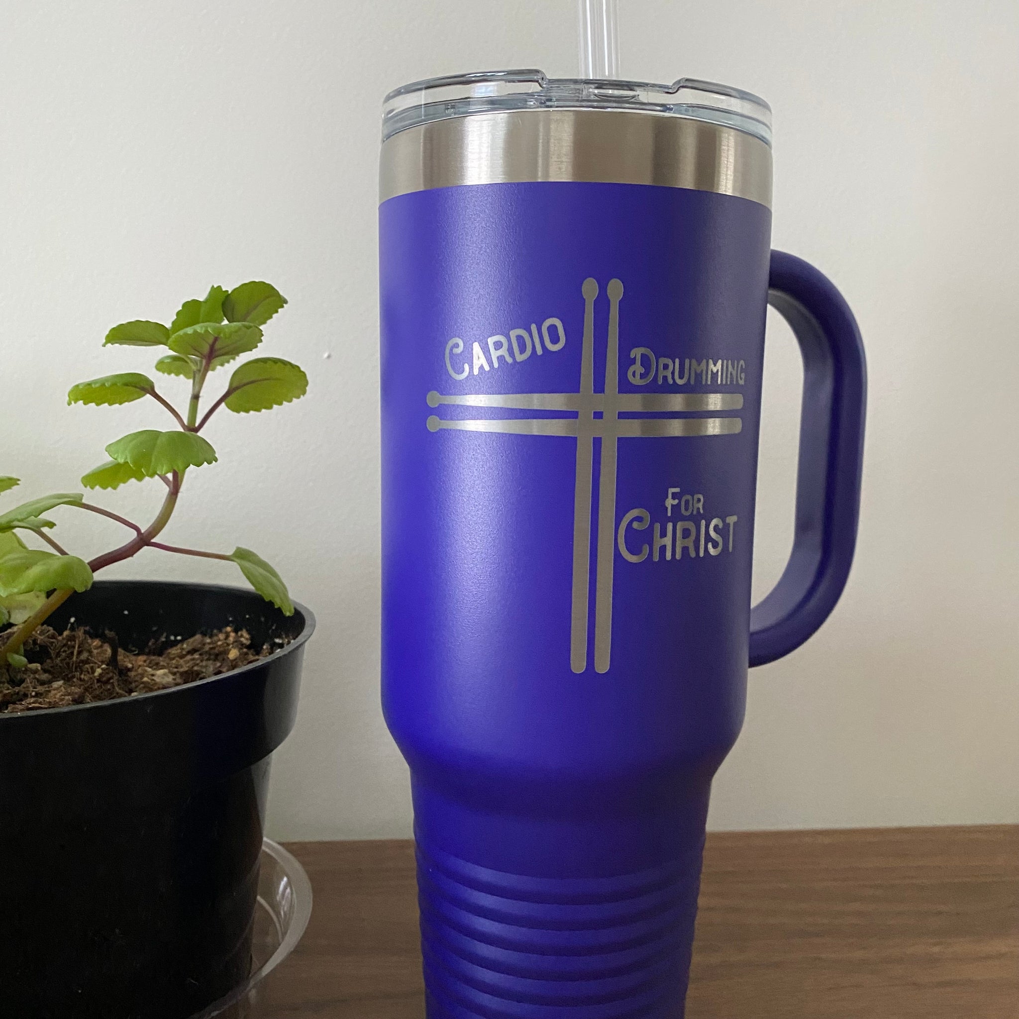 Choose between our 40 oz travel mug or 32 oz water bottle, both crafted from durable stainless steel with double-wall vacuum insulation to keep drinks at the perfect temperature. The travel mug includes a clear lid and straw with a narrow base that fits most cup holders. The water bottle features a larger base for stability—note that it may not fit all standard cup holders. Hand wash recommended. Ideal for your Cardio Drumming for Christ sessions and beyond.