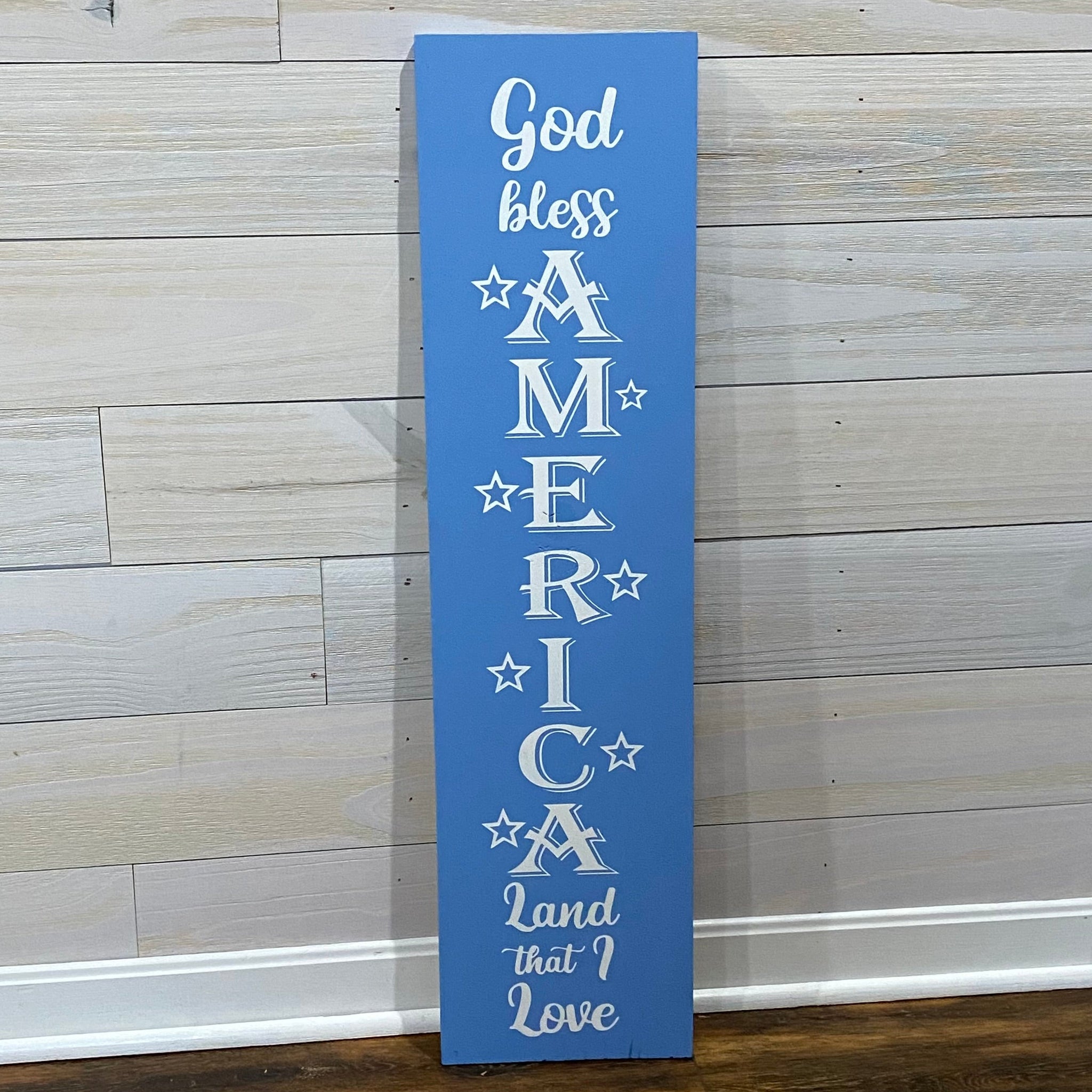 Display your patriotic spirit with this charming porch leaner sign that celebrates the red, white, and blue. Perfect for front porches, patios, or entryways, this wooden sign features the beloved patriotic phrase in a cheerful, eye-catching design. Whether you're decorating for Independence Day or year-round, it brings warmth and American pride to your space. A delightful way to show your love for this great nation while adding rustic charm to your home's curb appeal.