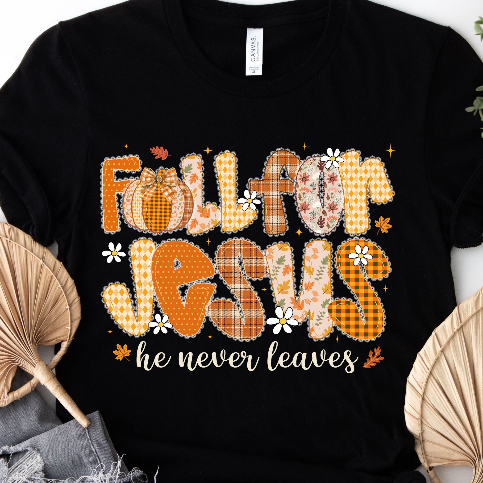 Embrace the season with a little spiritual flair! This Bella Canvas tee features a charming faux patchwork design that celebrates faith with a fun, autumnal twist. Perfect for layering under your favorite fall sweater or wearing solo, it's soft, comfortable, and makes a statement that's equal parts cozy and meaningful. Whether you're heading to a harvest festival or just want to spread some seasonal joy, this shirt brings warmth to your wardrobe—inside and out.
